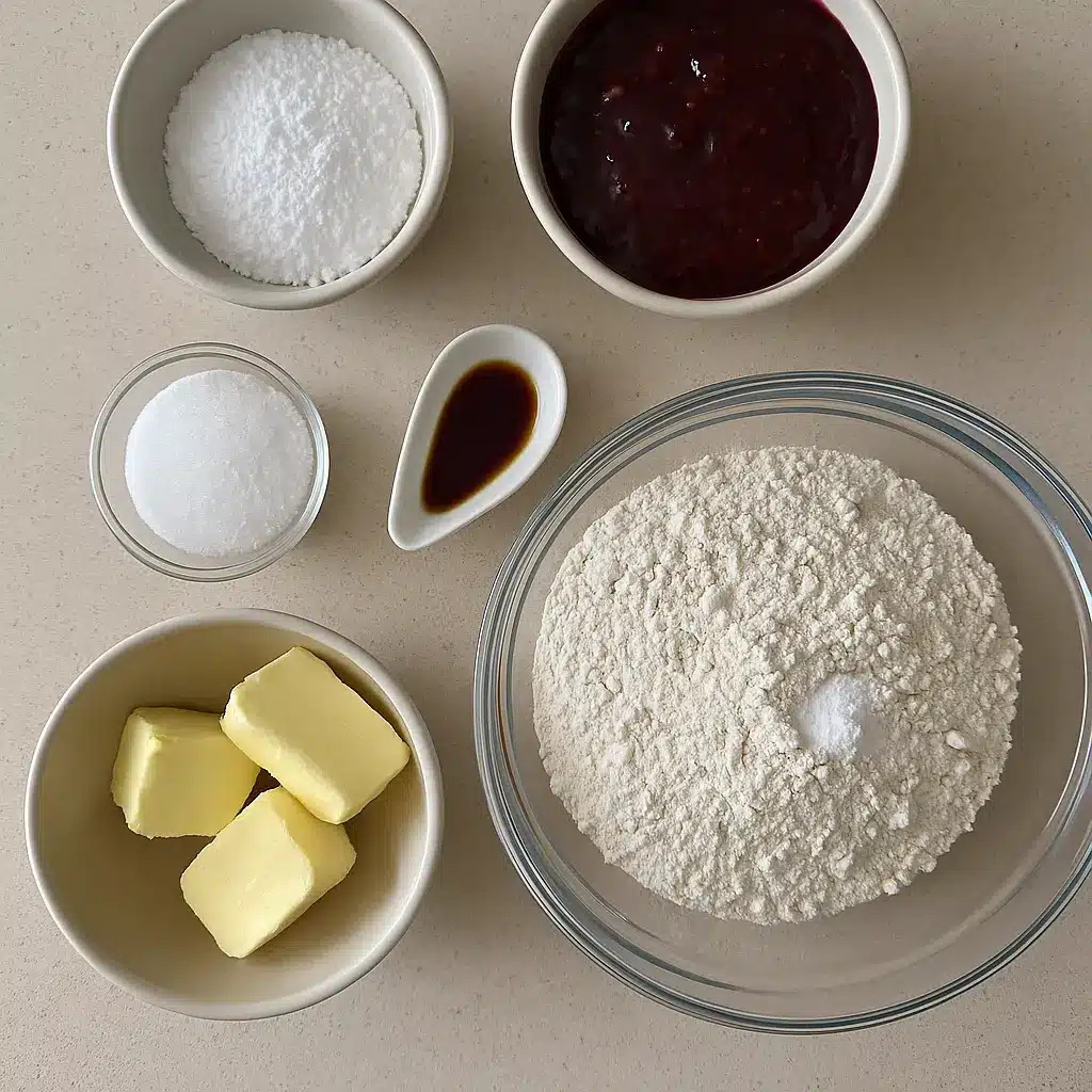 For this recipe, you will need very simple ingredients that you may already have on hand. You will need one cup of unsalted butter, softened, half a cup of granulated sugar, one teaspoon of vanilla extract, two cups of all-purpose flour, a quarter teaspoon of salt, half a cup of raspberry jam or your favorite jam, and optional powdered sugar for dusting after baking. Using good quality butter and a jam you truly enjoy will make a noticeable difference in both flavor and texture.
